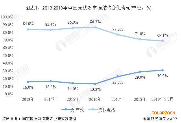 不同于光伏電站,分布式光伏發(fā)電是指在用戶所在場地或附近建設運行,以用戶側自發(fā)自用為主、多余電量上網(wǎng)且在配電網(wǎng)系統(tǒng)平衡調(diào)節(jié)為特征的光伏發(fā)電設施。近年來,國家對分布式光伏發(fā)電系統(tǒng)一直采取積極鼓勵的態(tài)度,并出臺了一系列扶持措施。2016年底出臺的《電力發(fā)展“十三五”規(guī)劃》對分布式光伏設定了超常規(guī)發(fā)展目標:“2020年,太陽能發(fā)電裝機達到1.1億千瓦以上,分布式光伏6000萬千瓦以上”。隨著各地分布式光伏發(fā)電建設的推進。我國光伏發(fā)電市場結構發(fā)生改變,尤其是2016年以來,我國分布式光伏市場份額已經(jīng)由13.3%提升至30.9%。