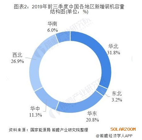 從新增裝機布局看,我國光伏發(fā)電由西向東的發(fā)展步伐穩(wěn)步推進,2019年前三季度,華北地區(qū)新增裝機508.6萬千瓦,占全國的31.8%;東北地區(qū)新增裝機51.2萬千瓦,占全國的3.2%;華東地區(qū)新增裝機332.2萬千瓦,占全國的20.8%;華中地區(qū)新增裝機180.9萬千瓦,占全國的11.3%;西北地區(qū)新增裝機430.8萬千瓦,占全國的26.9%;華南地區(qū)新增裝機95.5萬千瓦,占全國的6%。